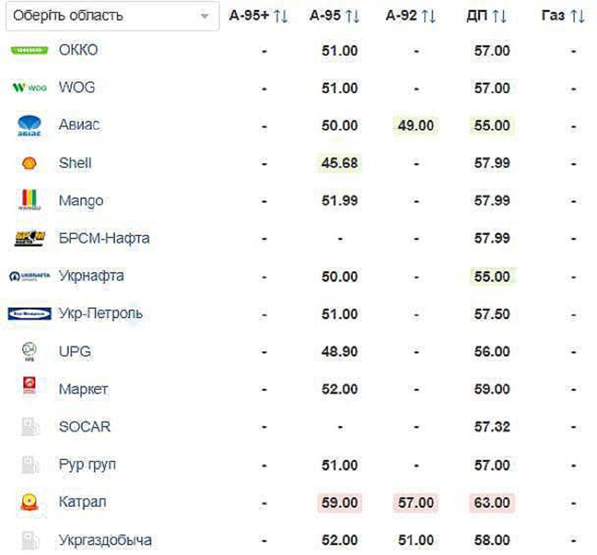 В таблице представлены усредненные цены на АЗС по всей Украине, которые могут отличаться в городах, в зависимости от региона страны.