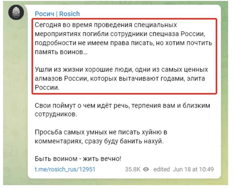 В российских Telegram-каналах добавляют, что украинские военные уничтожили в целом группу элитных спецназовцев российской ФСБ. И "Термит" – один из тех, о ком было "разрешено" распространить информацию в сети.