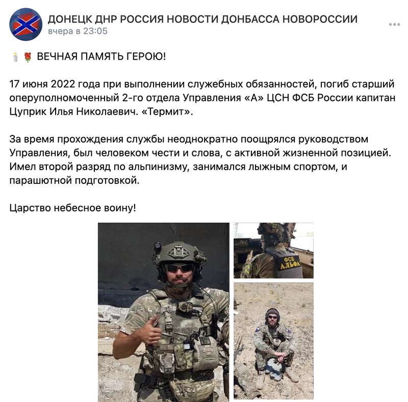 Украинские военные уничтожили группу элитного спецназа ФСБ. "Денацифицирован и демилитаризован" в том числе и старший оперуполномоченный 2-го отдела управления "А" центра спецназначения ФСБ Илья Цуприк с позывным "Термит".