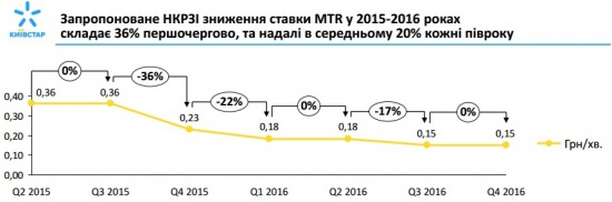 Первая предложенная НКРСИ новая ставка доступа - 23 коп за минуту - на 36% ниже существующей. Каждые следующие полгода комиссия хочет снижать этот тариф еще в среднем на 20%. Значит, уже к 2017 году межсетевой тариф будет составлять 0,15 коп в минуту, но и это, вероятно, не предел.