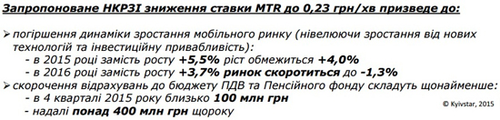 Крупные операторы хотят действовать осторожно. Представители "Киевстара" предупредили, что резкое снижение может привести к уменьшению рынка связи в краткосрочной перспективе до нескольких процентов ежегодно вместо его незначительного роста. По оценкам компании, при сниженной до 23 коп ставке рынок в 2016 году может оказаться на 1,7 млрд грн меньше, чем при нынешней.