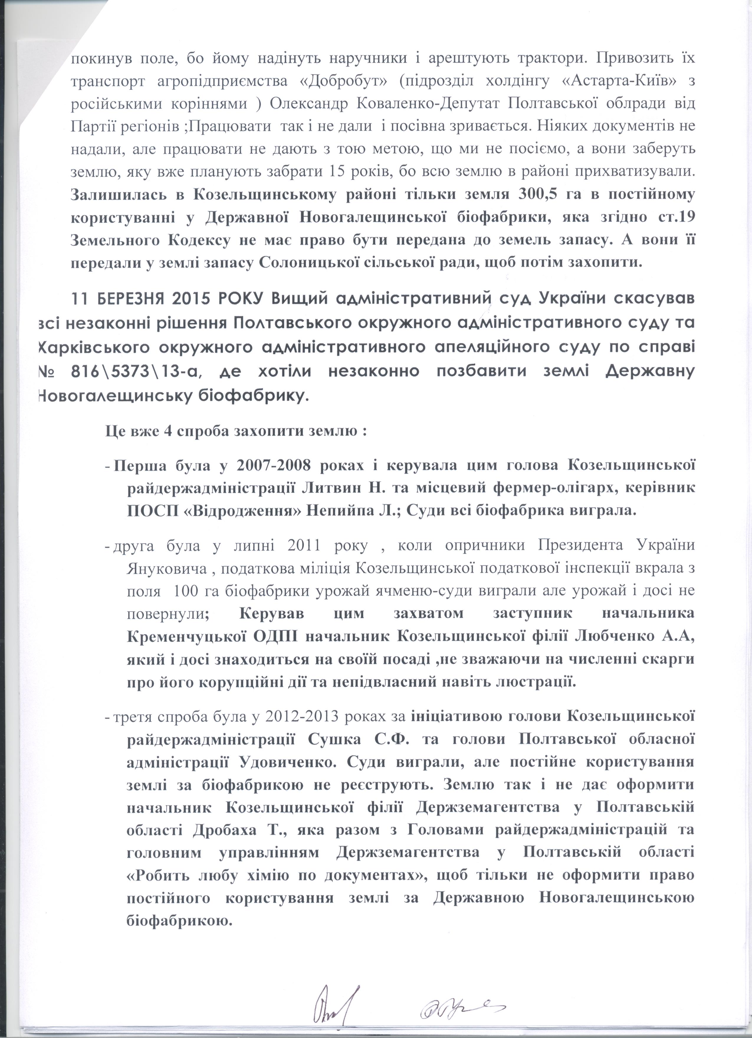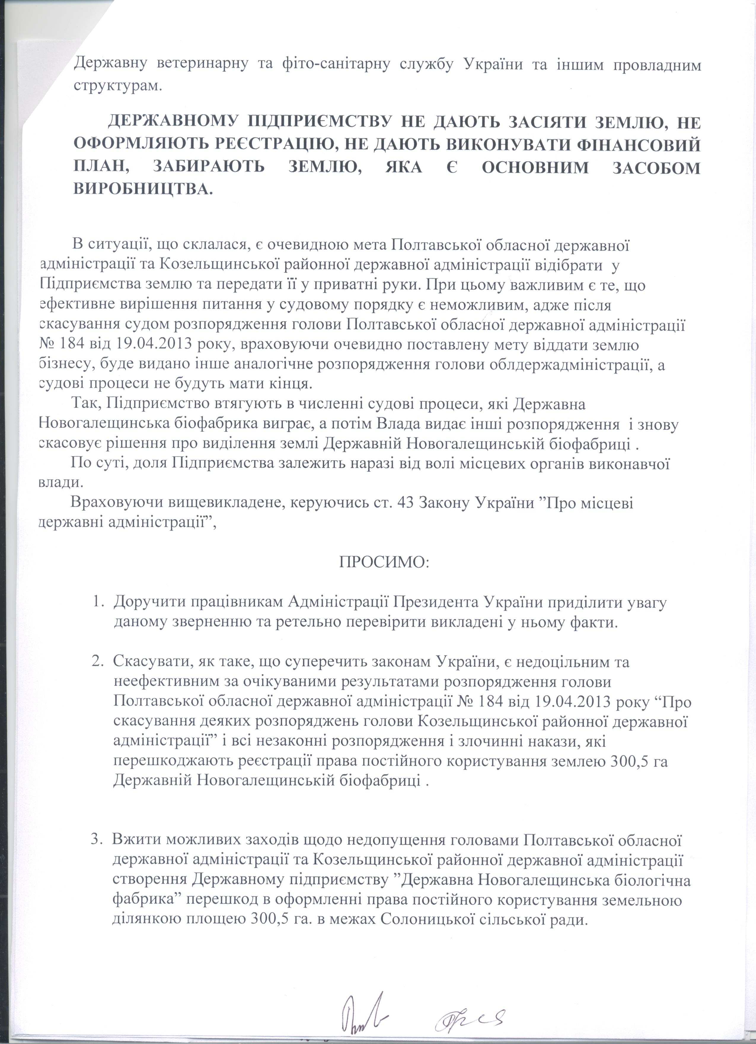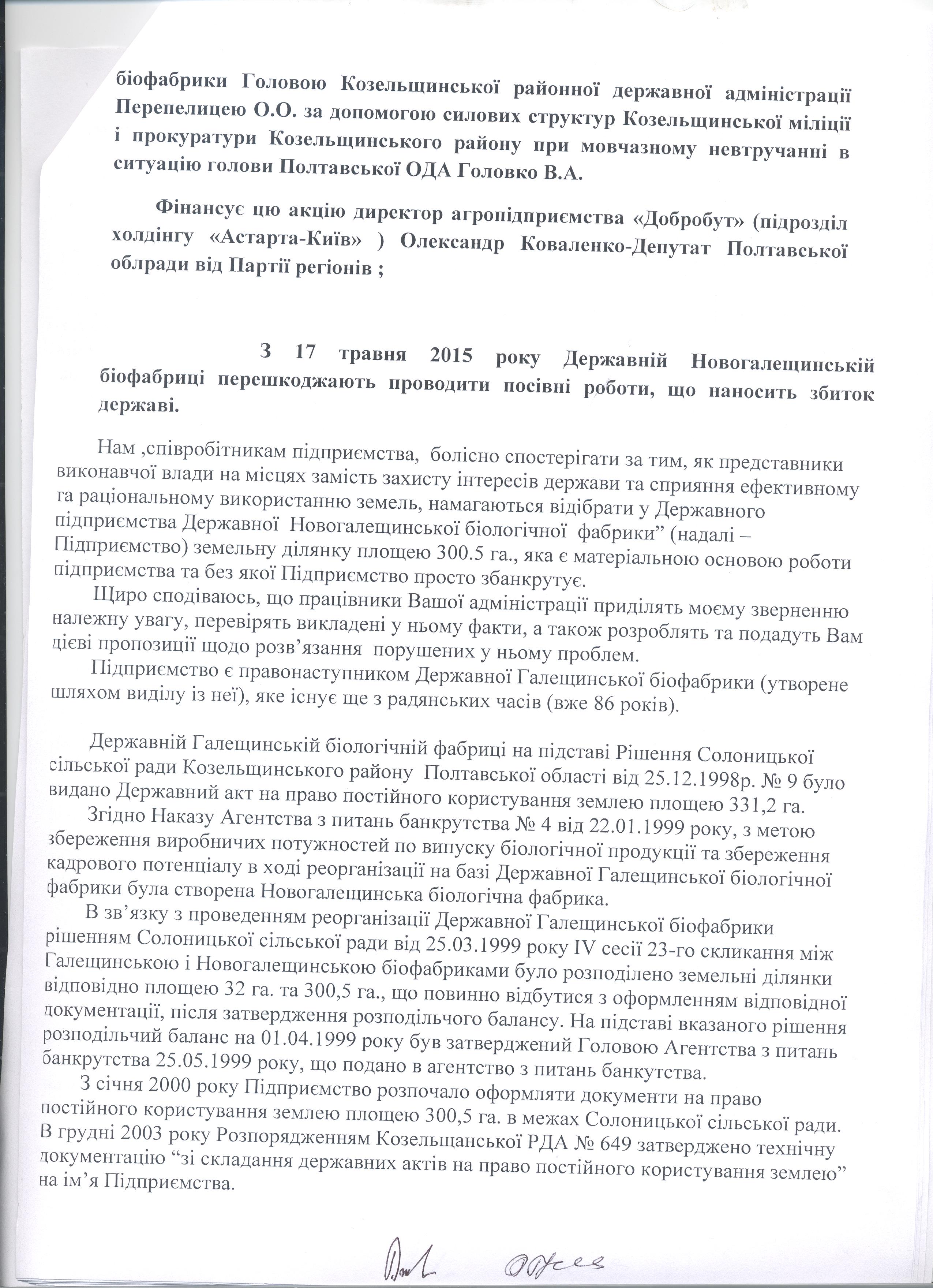 На пошту ГО "Останній Бастіон" надійшов лист із документами, рішеннями й судовими справами та зверненням до Президента Петра Порошенка, у яких викриваються незаконні дії першого заступника керівника головного управління Державного агенства земельних ресурсів у Полтавській області Шарого Г.І., в.о. начальника Головного управління Держземагенства у Полтавській області Сколота Я.Ю., арбітражного керівника Терещенка О.В., голови Козельщинської РДА Перепелиці О.О., які вчинили ряд протиправних дій, спрямованих на переведення з державного в приватне користування земельної ділянки, площею 300 га, 5 із яких перебувають у межах Солоницької сільради Козельщинського району та належить Державній Галещинській біофабриці.