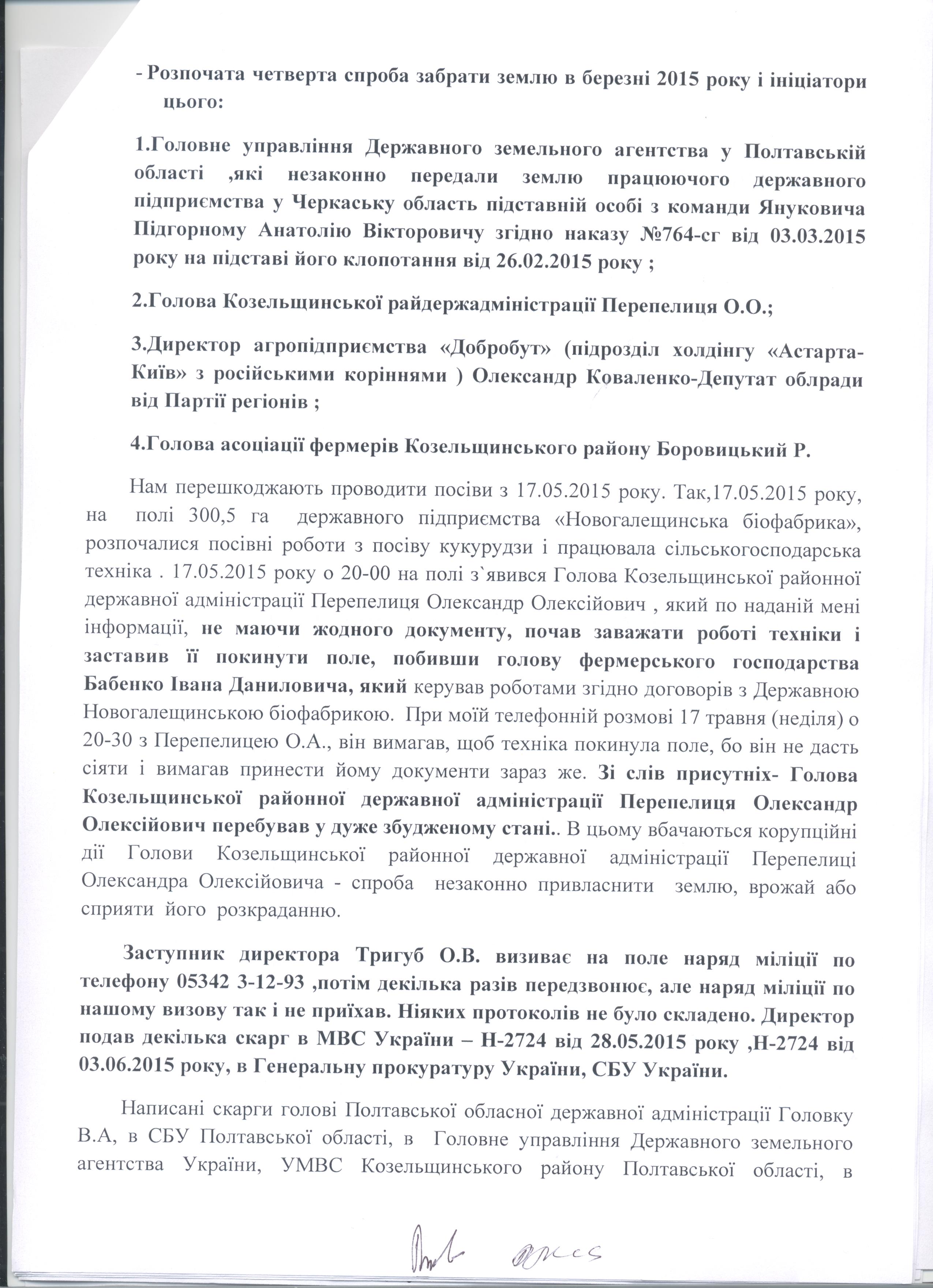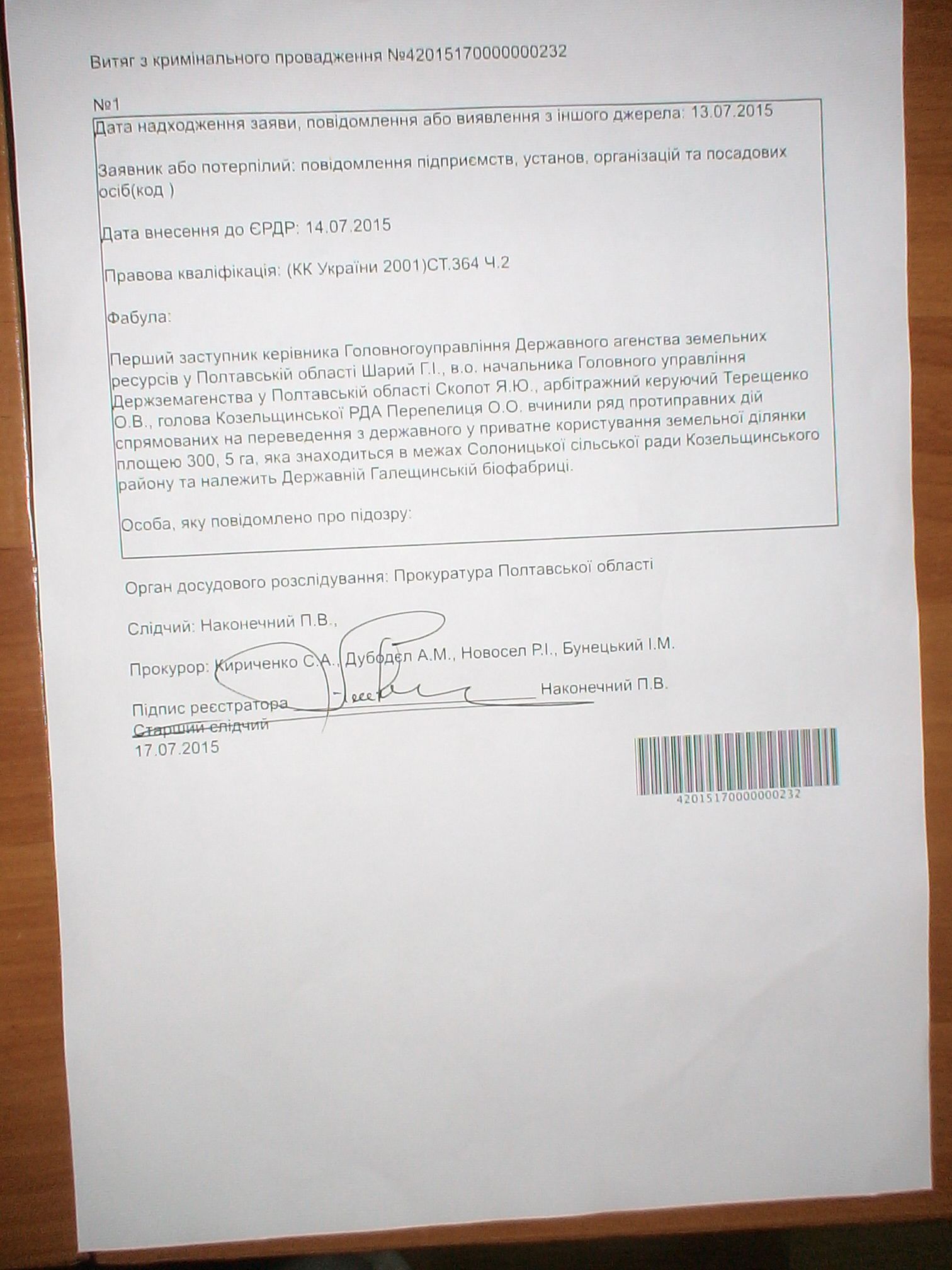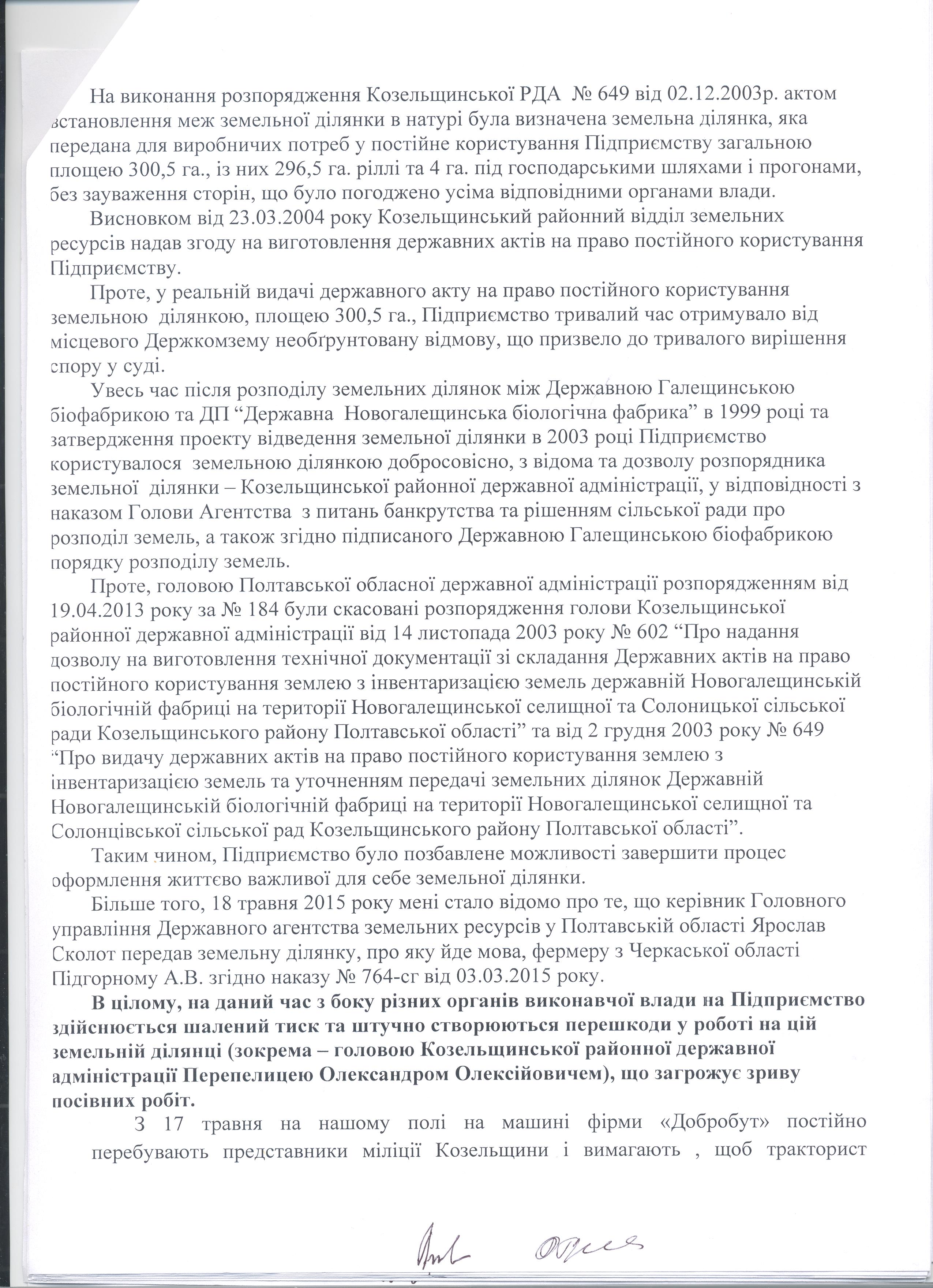На пошту ГО "Останній Бастіон" надійшов лист із документами, рішеннями й судовими справами та зверненням до Президента Петра Порошенка, у яких викриваються незаконні дії першого заступника керівника головного управління Державного агенства земельних ресурсів у Полтавській області Шарого Г.І., в.о. начальника Головного управління Держземагенства у Полтавській області Сколота Я.Ю., арбітражного керівника Терещенка О.В., голови Козельщинської РДА Перепелиці О.О., які вчинили ряд протиправних дій, спрямованих на переведення з державного в приватне користування земельної ділянки, площею 300 га, 5 із яких перебувають у межах Солоницької сільради Козельщинського району та належить Державній Галещинській біофабриці.