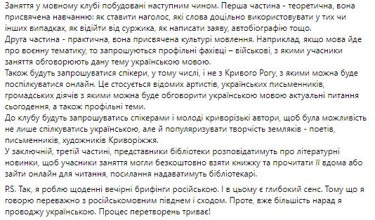 С 1 июля в Кривом Роге открылись клубы "общаемся по-украински", и онлайн-курсы "говорим по-украински правильно". Всего в городе 23 таких клуба, которые собираются дважды в неделю.