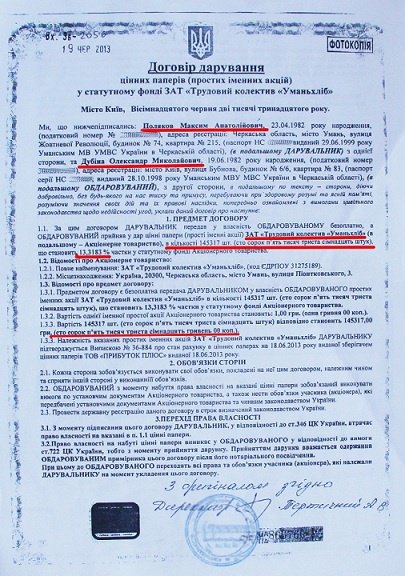 Напомним, в 2013 году Максим Поляков путем мошеннического обмана  стал обладателем 13% акций «Уманьхлеб» на сумму 150 тысяч гривен. Несмотря на статус подозреваемого и объявление во всеукраинский розыск, Максиму Полякову удалось трижды закрыть против себя дело в прокуратуре г.Умань, однако скрыть информацию о получении этих акций все же не удалось.