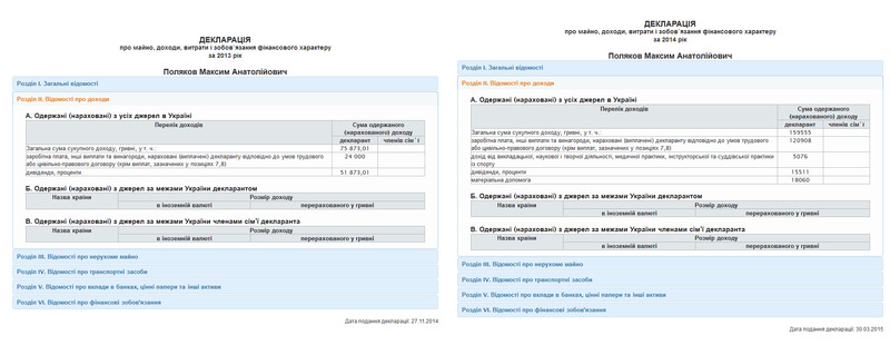 Народному депутату от «Народного фронта» Максиму Полякову угрожает до двух лет тюремного заключения за указание недостоверных сведений в декларации.