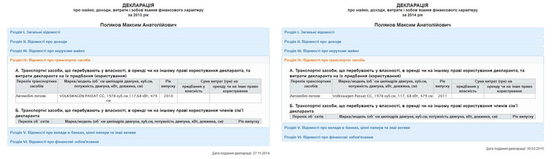 Помимо акций «Уманьхлеб», народный избранник «запутался» со своими активами. Так, Максим Поляков в декларации за 2013 году отметил, что его транспортное средство Volkswagen Passat CC – 2011 года, однако через год, в декларации за 2014, нардеп отмечает, что тот же автомобиль уже не 2011 года, а  2010 года.