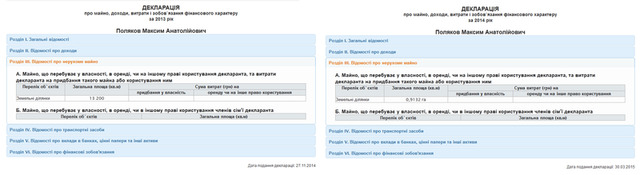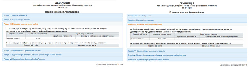 Аналогично, народный депутат не смог справиться с подсчетам собственной земли. Так, в декларации М.Поляков за 2013 указано, что он владеет земельным участком площадью 13 200 кв.м. Однако, в декларации за 2014 Поляков сообщает, что уже не владеет этим участком, ибо обладает другим, площадью 0,9132 га. При этом доход от отчуждения земли нардеп также не указал.