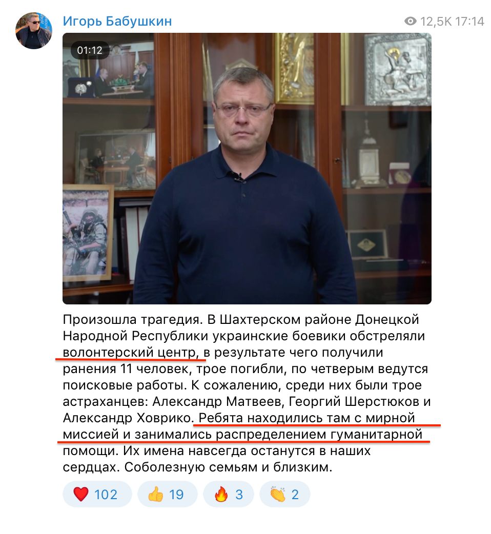 Само собой, дальше начинаются лживые причитания о том, что погибли невинные волонтеры, которые просто грузили гуманитарную помощь. С характерным враньем выступил целый губернатор Астраханской области, откуда были трое погибших "волонтера" и МММщик Пушилин, который и отправил их на смерть.