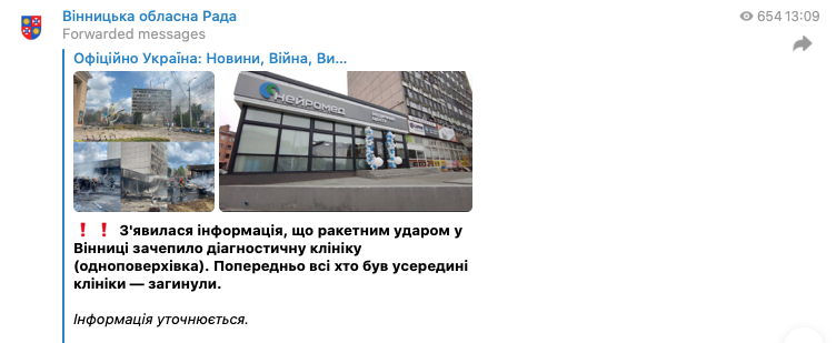 Ракетным ударом по центру Винницы также зацепило диагностическую клинику. По предварительным данным, все люди, которые были внутри, погибли.