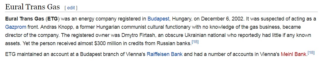 Справка: Eural Trans Gas (ETG) – энергетическая компания, зарегистрированная в Будапеште, Венгрия, 6 декабря 2002 года. Ее подозревали в том, что она действует как прикрытие «Газпрома». Директором компании стал Андраш Кнопп, бывший венгерский коммунист, культурный деятель, ничего не смысливший в газовом бизнесе. Зарегистрированным владельцем был Дмитрий Фирташ, на тот момент мало кому известный предприниматель из Украины. Известно, что он в качестве владельца Eural Trans Gas получил почти 300 миллионов долларов в виде кредитов от российских банков. У ETG был счет в будапештском отделении венского банка Raiffeisen Bank, а также несколько счетов в венском Meinl Bank.