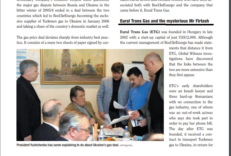 В апреле 2006 года лондонская служба по борьбе с коррупцией Global Witness опубликовала отчет, посвященный «Росукрэнерго» и другим транзитным компаниям, выступавшим в качестве посредников между Туркменистаном, Россией и Украиной. В отчете подчеркивается «наличие множества кадровых связей между RosUkrEnergo и предыдущим посредником Eural Trans Gas». Согласно сообщению, израильский юрист Зеэв Гордон зарегистрировал Eural Trans Gas от имени украинского бизнесмена Дмитрия Фирташа.