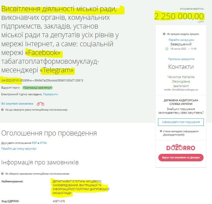 2 250 000 грн. на висвітлення діяльності міської ради Дніпра в мережі Facebook та Telegram 18.07.2022 (тендер завершується)