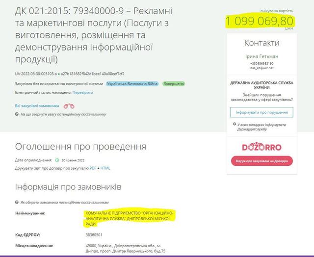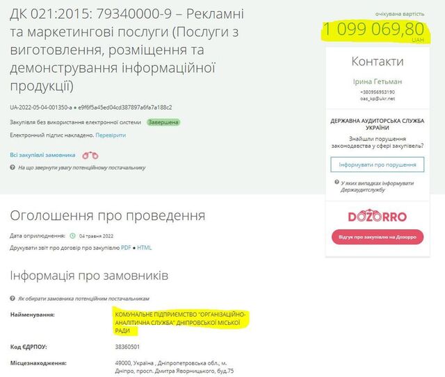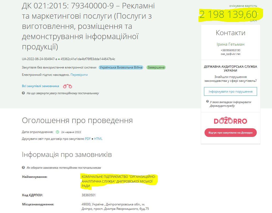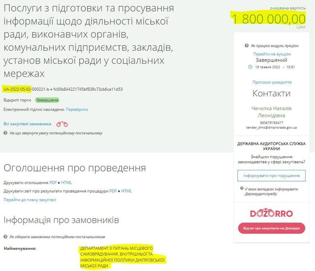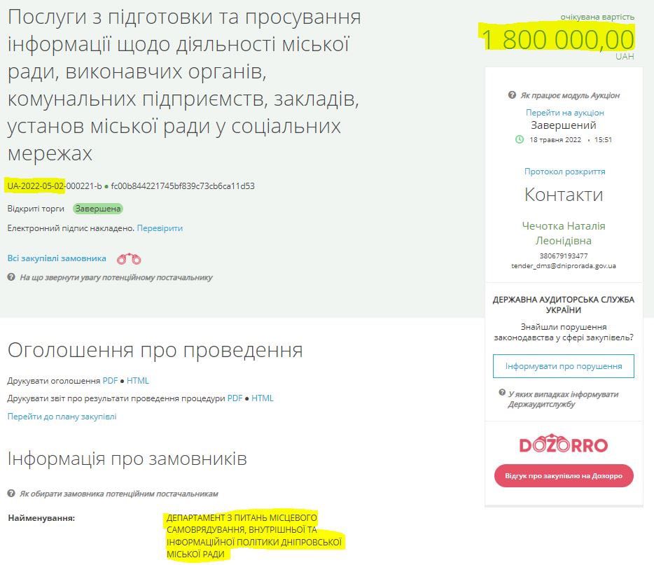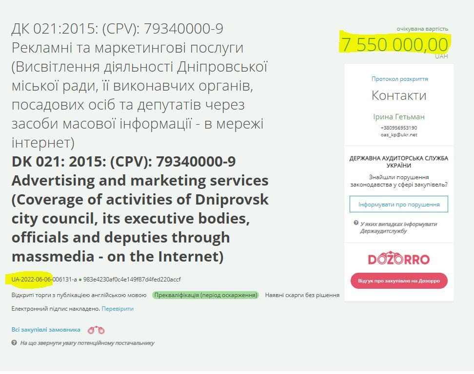 7 550 000.00 грн. на висвітлення діяльності міської ради Дніпра та депутатів в мережі інтернет. 6.06.2022 (тендер оскаржується).