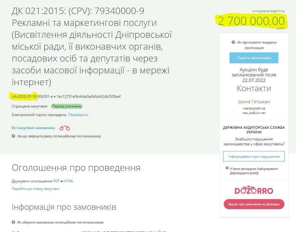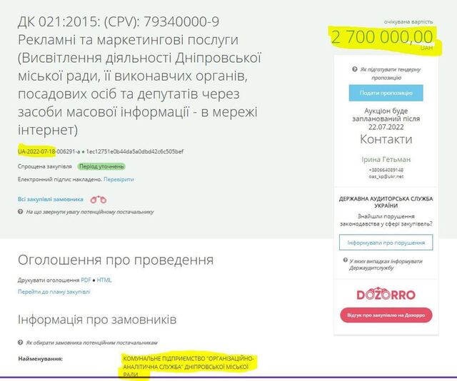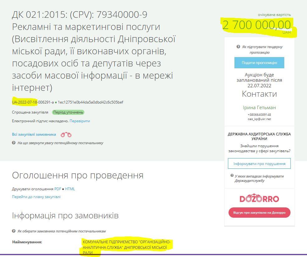 2 700 000,00 грн. на висвітлення діяльності міської ради Дніпра та депутатів в мережі інтернет. 18.07.2022 (тендер завершується)