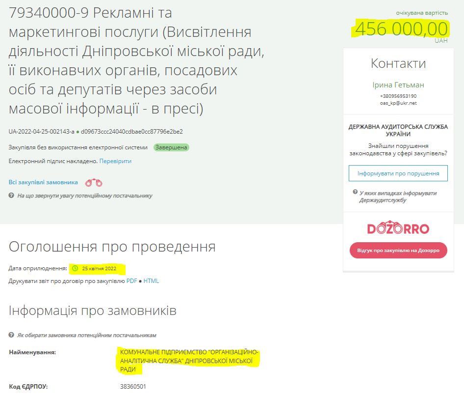 456 000,00 грн. на висвітлення діяльності Дніпровської міськради в пресі 25.04.2022
