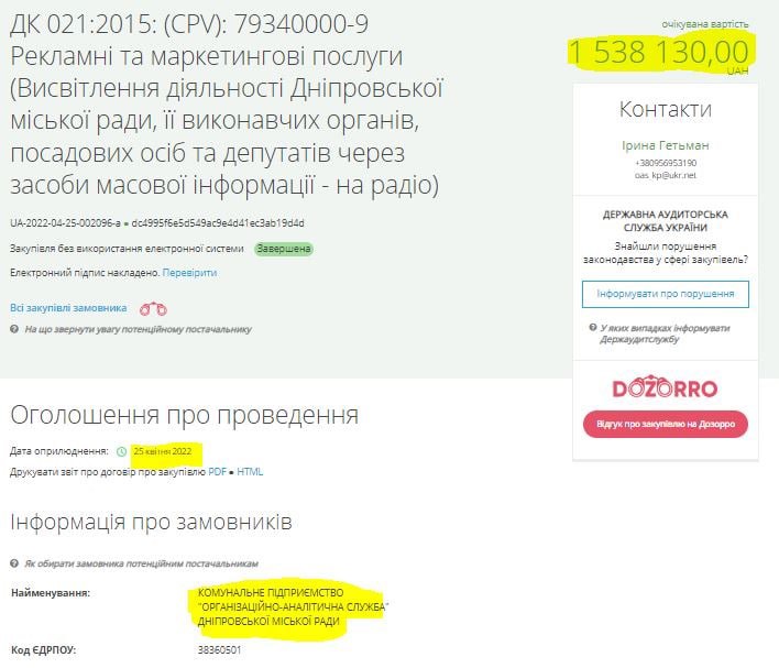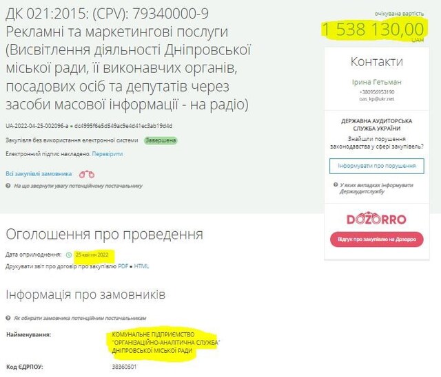 1 538 130.00 грн. на висвітлення діяльності Дніпровської міськради на радіо 25.04.2022