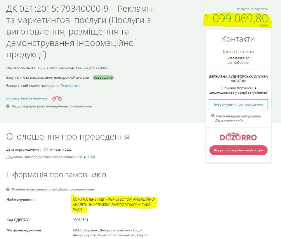 1 099 069.80 грн. на рекламні та маркетингові послуги 04.05.2022