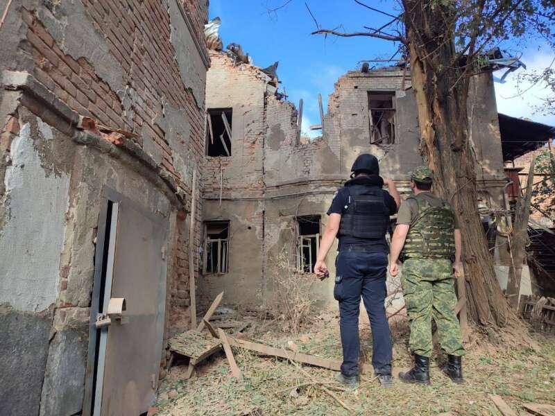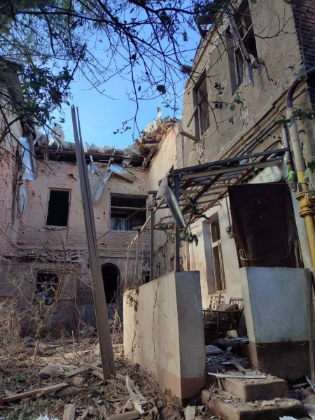 "Ще один результат ранкового прильоту. Вибиті вікна у самому ВНЗ та в будинках навпроти, глибока вирва перед входом до навчального закладу, пошкоджена пам’ятка вченому", - пише Терехов.
