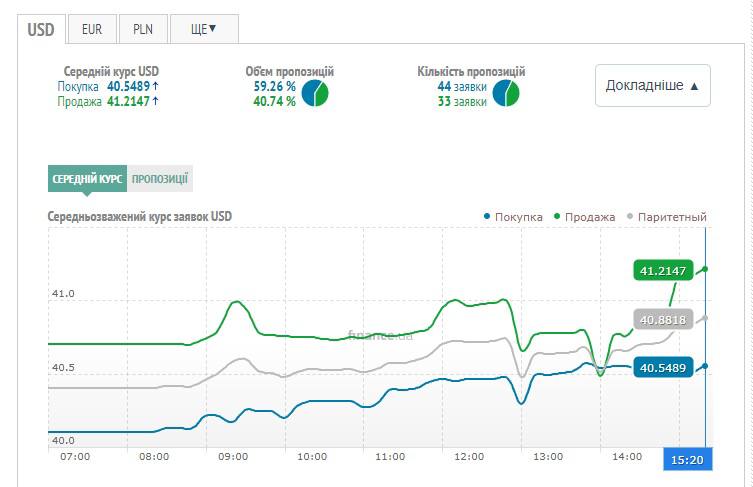 Курс долара сьогодні, 28 липня, продовжив зростати. На чорному ринку день розпочинався продажами на рівні 40,21 грн/$, але вже о 15:20 ціна додала одразу гривню та досягла 41,21 грн/$.