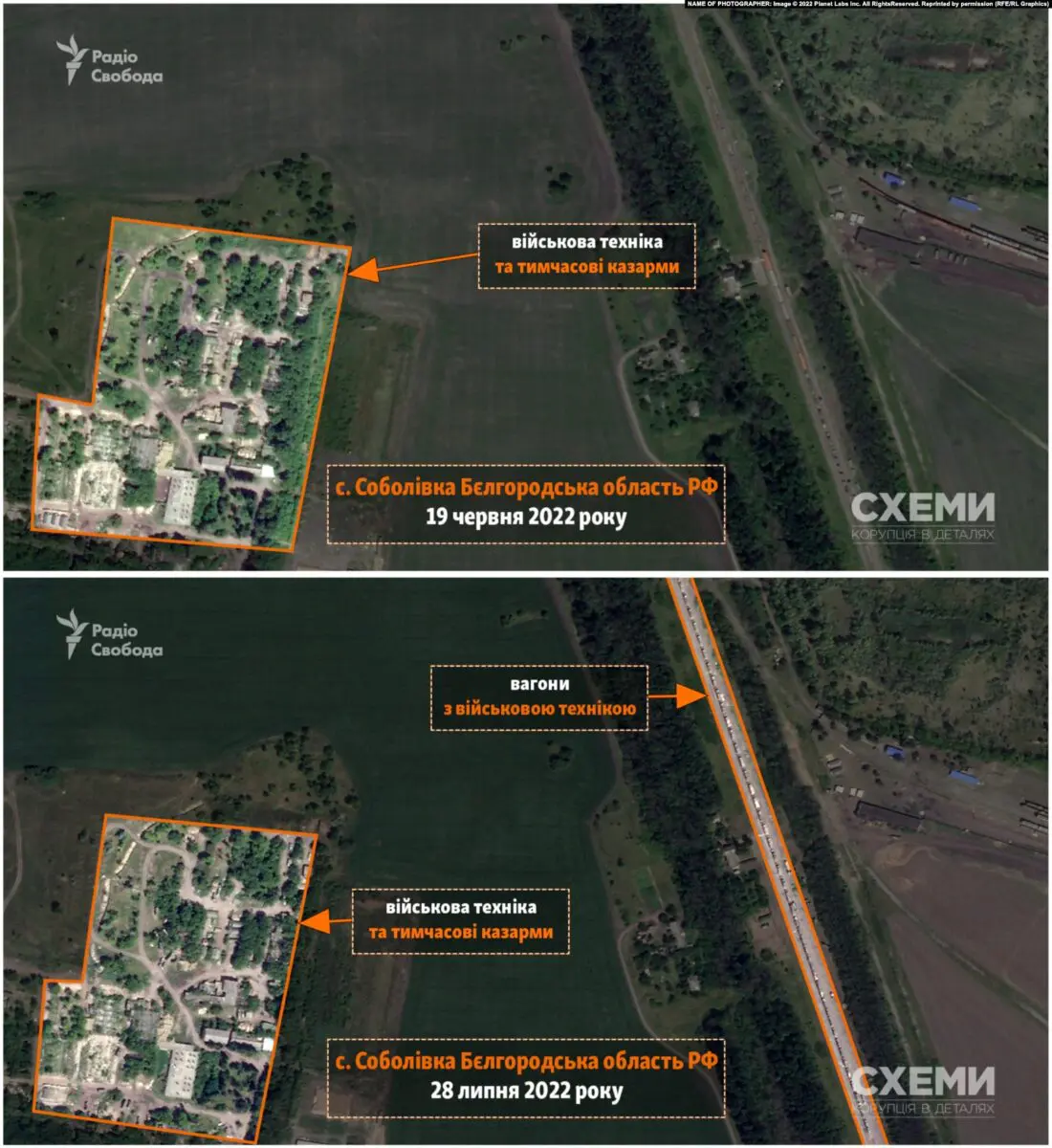 Як зазначили «Схеми», аналізуючи супутникові фото, територія цього села, як і раніше, використовувалася військовими РФ для розміщення техніки. Супутник також зафіксував момент, як 28 липня військову техніку доставили до Соболівки залізничними вагонами.