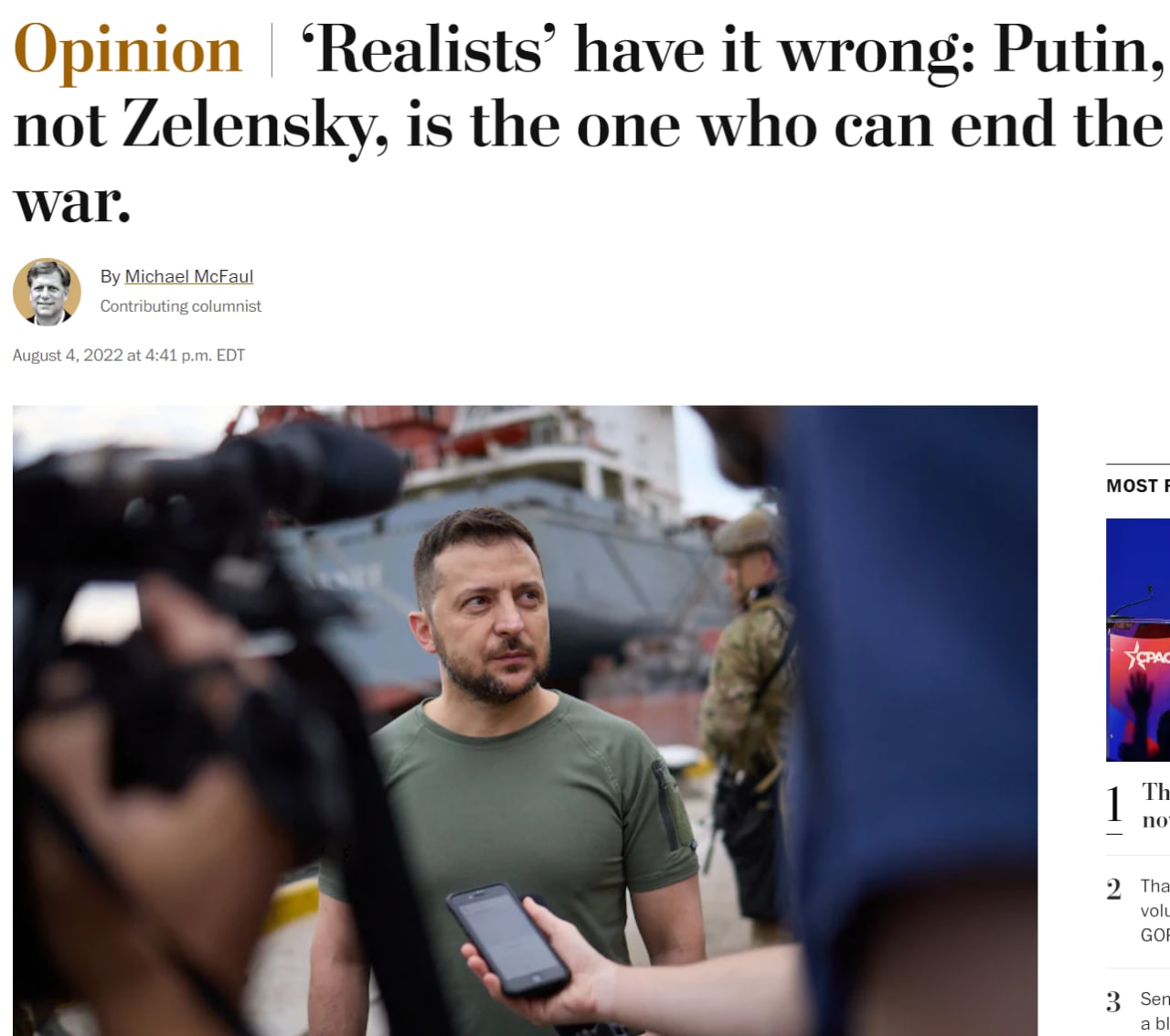 Приблизно про те саме в нещодавній колонці для New York Times написав колишній посол США в Росії Майкл Макфол. Він обрушився на "реалістів", які вимагають від Зеленського поступок Путіну (серед таких згадуються Макрон і Кісінджер) і вимагає наростити постачання зброї Києву.