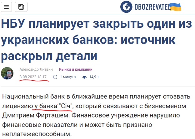 Але це ще не все. Буквально кілька годин тому той самий «Обозреватель» розмістив ще одну новину про цей скандальний банк, у якій таки заявив, що НБУ закриє «Січ» і що правління вже підготувало відповідне рішення. Що взагалі відбувається?