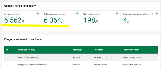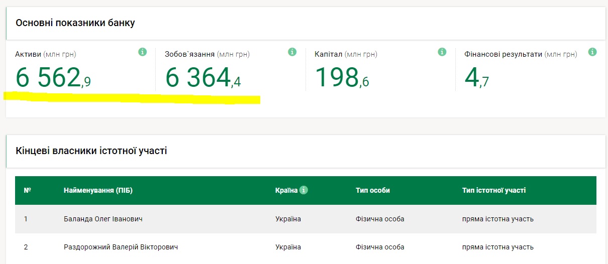 Активи становлять понад 6,5 мільярда гривень, а зобов’язання – майже 6,4 мільярда. І це за капіталу менше 199 мільйонів гривень. Так само багато про що говорить і прибуток. За таких величезних мільярдних активів банк отримав фінансовий результат лише у розмірі 4,7 мільйона гривень.