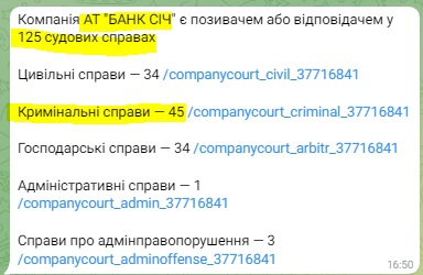 За інформацією реєстру OpenData, цей банк проходить у 125 судових справах, у тому числі й у кримінальних справах.