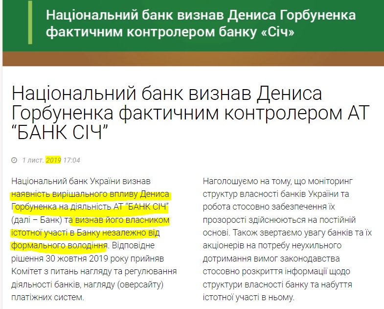 Варто згадати, що ще три роки тому Дениса Горбуненка, екс-акціонера «Родовід банку», визнано НБУ фактичним контролером акціонерного товариства «Банк Січ». Саме товариш Горбуненко є власником суттєвої участі у банку незалежно від формального володіння. Саме він має ключовий вплив на діяльність цієї банківської організації.