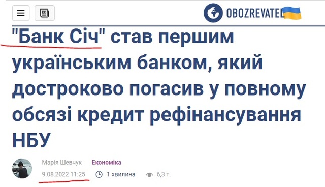Аж раптом, уже вранці 9 серпня, на тому ж сайті з’явилася новина про те, що цей банк достроково погасив кредит рефінансу від НБУ у повному обсязі. Та й взагалі, мовляв, «Січ» став першою банківською установою в країні, яка це зробила. Причому другий матеріал написаний явно в рекламному стилі, який славить цей банк. Як кажуть, сайт заробив, мабуть, непогано.