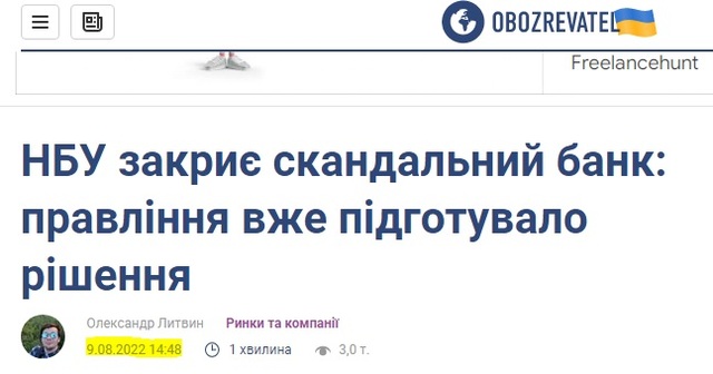 Цікавий момент: одразу після вчорашньої публікації на сайті «Обозреватель» скандальної новини про банкрутство банку, з’являється новий матеріал із явними ознаками реклами.