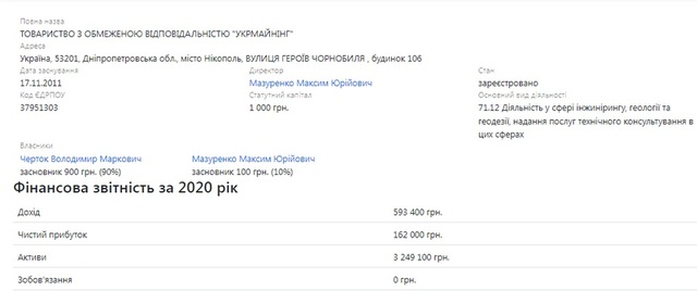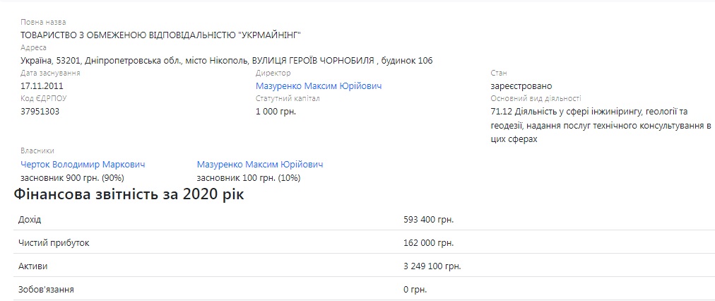 Володимир Черток у 2017 році зареєстрував у Женеві фірму «Укрмайнінг СА». Сфера діяльності – індустрія інженерних послуг, штат – 4 співробітники, а річний дохід 406 тисяч доларів, що за швейцарськими мірками дуже середньо. В Україні Черток є співвласником фірми з такою самою назвою. Вона зареєстрована у Нікополі, а сфера діяльності – інжиніринг, геологія, геодезія та посередництво у торгівлі паливом, рудами, металами та промисловими хімічними речовинами.