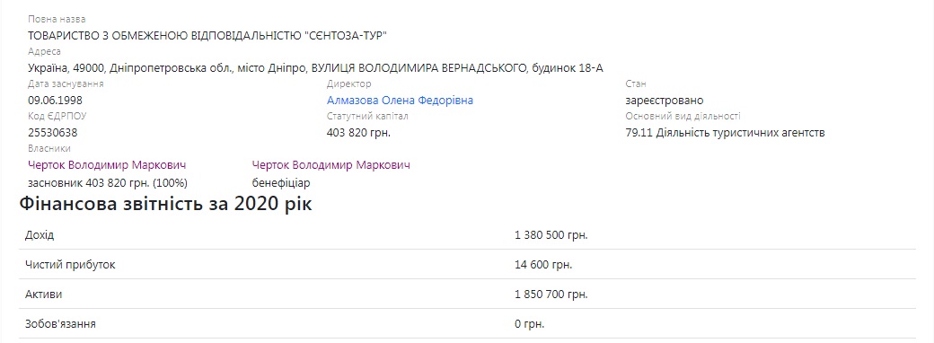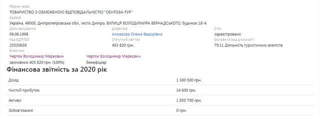 Ще один бізнес зятя Коломойського – туристичний. Він є бенефіціаром компанії «Сентоза-Тур», сайт якої не працює.