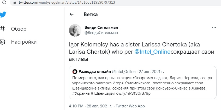 Власне, розслідування про Ларису Черток вже не перше – ще у 2019 році, коли вона потрапила у поле зору журналістів Швейцарії, OCCRP (Центр з дослідження корупції та організованої злочинності – Organised Crime and Corruption Reporting Project) – об’єднання ЗМІ та окремих репортерів, які займаються журналістськими розслідуваннями. ) провів власне розслідування.