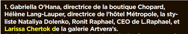 Знайти фотографії Лариси Валеріївни в інтернеті дуже складно, але нам вдалося. Так, газета «Трибуна Женеви» від 13.12.2019 опублікувала матеріал із однієї розкішної швейцарської вечірки, на якій також була присутня і Лариса Черток. На гламурному заході вона представляла свою галерею Artvera’s.