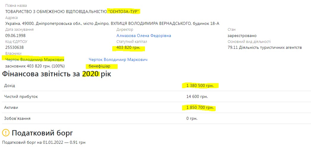 Друга українська фірма, що належить чоловікові, це ТОВ "Сентоза-тур". Статусний фонд складає майже 404 тисячі гривень.