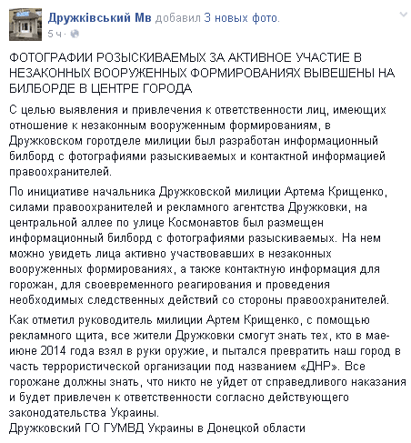 "С целью выявления и привлечения к ответственности лиц, имеющих отношение к незаконным вооруженным формированиям, в Дружковском горотделе милиции был разработан информационный билборд с фотографиями разыскиваемых и контактной информацией правоохранителей", - говорится в сообщении Дружковской милиции.