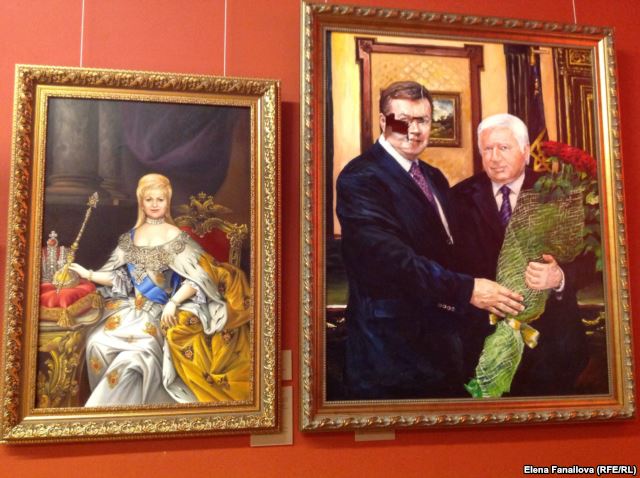 – Это замечательная стилизация под героическую батальную сцену. Кроме того, рядом висит портрет жены Пшонки в виде Елизаветы Петровны, императрицы, парадный псевдопортрет. И, как кураторы наши обозначили, портрет Януковича  и Пшонки в позах суверена и вассала. Такие правильные иерархии показаны на этом портрете.