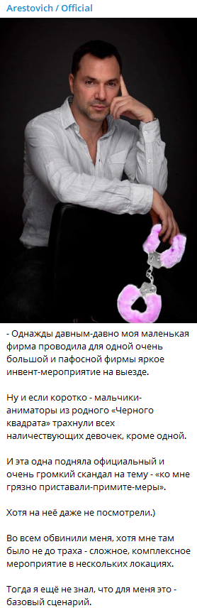 Втім, пізніше Арестович вирішив відредагувати свою посаду, прибравши два останні рядки та прикріпивши кумедне фото з рожевими кайданками, які продаються у секс-шопі.