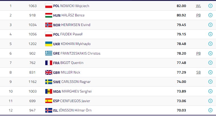 А в секторі для метання молота наш Михайло Кохан показав п’ятий результат, закинувши снаряд на 78,48 м. Чемпіоном Європи став поляк Войцех Новицький з результатом 82 м, другий результат у угорця Бенче Халаша (80,92 м), третій — у норвежця. Ейвінда Хенріксена (79,45 м).