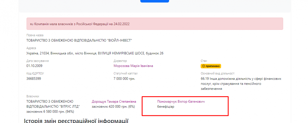 У результаті національна комісія з цінних паперів та фондового ринку (НКЦПФР) анулювала ліцензії ТОВ «ВіОйл-Інвест» (Київ) на здійснення дилерської та депозитарної діяльності у зв’язку із встановленням факту контролю над суспільством осіб держав, які здійснюють озброєну агресію проти України. Відповідне рішення було ухвалено регулятором 26 липня 2016 року. Нацкомісія зокрема встановила, що прямим власником ТОВ «ВіОйл-Інвест», з часткою 94%, є ТОВ «Вітрус ЛТД» (Київ). У свою чергу прямим власником ТОВ «Вітрус ЛТД» з часткою 99,9895% є громадянин Росії Віктор Пономарчук.