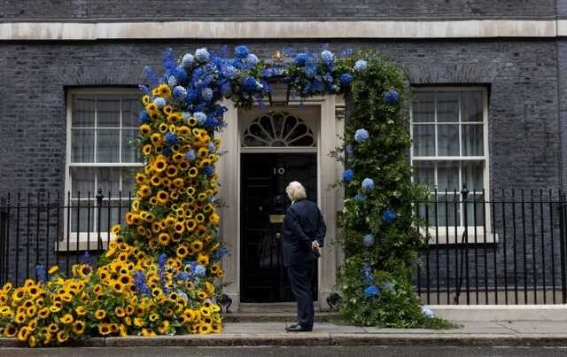 На честь Дня незалежності України Даунінг-стріт прикрасили соняшниками та блакитними та синіми гортензіями.