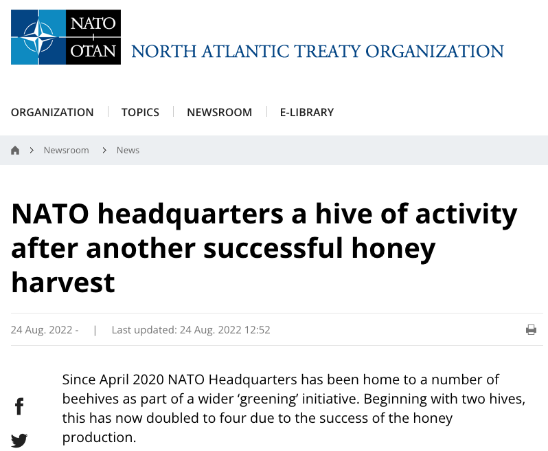 Штаб-квартира НАТО у Брюсселі зайнялася виробництвом меду. Прямо на території штаб-квартири встановили чотири вулики в рамках участі у європейських екологічних проектах.