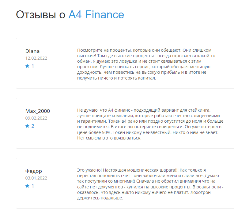 Як ми з’ясували, вони всі, окрім українця Фельдмана, з Росії та Білорусі. Відгуки про A4 finance (a4.finance) ви можете побачити суперечливі. Хтось нахвалює цей проект, хтось вважає це звичайною пірамідою, яка прикривається криптовалютною діяльністю. Але відповісти на запитання – що це таке можна без особливих зусиль. Юридична адреса у фірми відсутня, телефон та пошта також.