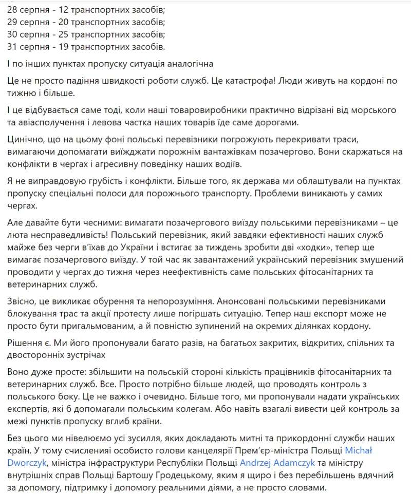 Він стверджує, що проблема – не в українських митниках та прикордонниках, а в низькій ефективності роботи польських служб, які проводять фітосанітарний та ветеринарний контроль. Тому черги з української сторони сягають від 10 до 45 кілометрів, а з польської – максимум 5 км.