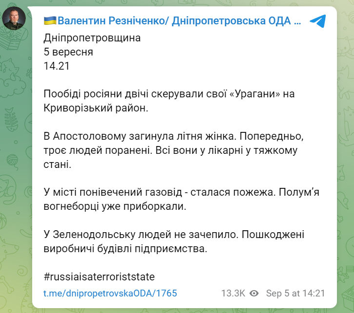 Сьогодні після обіду російські військові з допомогою "Ураганів" атакували Дніпропетровську область.