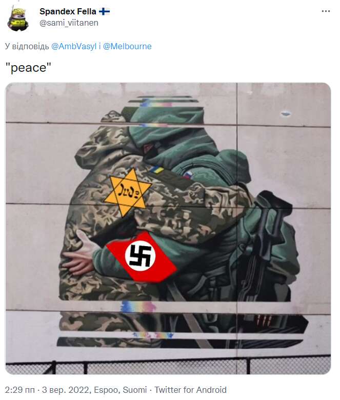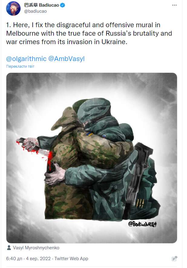 «Показувати обійми російського та українського солдатів — це вкрай образливо для українців. Художник нічого не розуміє про вторгнення РФ в Україну, і дуже прикро бачити, що це було зроблено без консультацій з українською громадою у Мельбурні», — написав він у своєму Twitter.