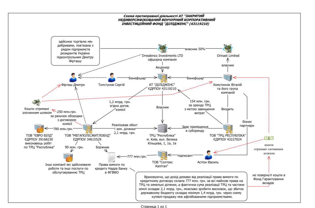 Якщо торговий центр управляється інвестиційним фондом «Ділідженс» (бенефіціар Сергій Толстунов, Хомутинник), то самі орендні площі належать до однієї з компаній групи Хомутинника - ТОВ «ТРЦ Республіка». Саме вона здає в оренду приміщення торгового центру АТ «Ділідженс» за 154млн гривень за завищеною ціною з метою збільшення витрат та уникнення оподаткування. Самим же будівництвом ТЦ Республіка, за рахунок кредитних грошей «Надра Банку» у розмірі 2,59 млрд грн., займалася компанія «Мегаполісжитлобуд», яка зрештою вклала в об’єкт 2,1 млрд гривень, з яких: • послугами підрядників ТОВ «Євро білд» – 780млн гривень та інших виконавців робіт – 90 млн гривень, • 1,2 млрд гривень було отримано від АТ «Ділідженс» за договором комісії. Надалі 250 млн. гривень з яких виведено на компанію Фірташа.