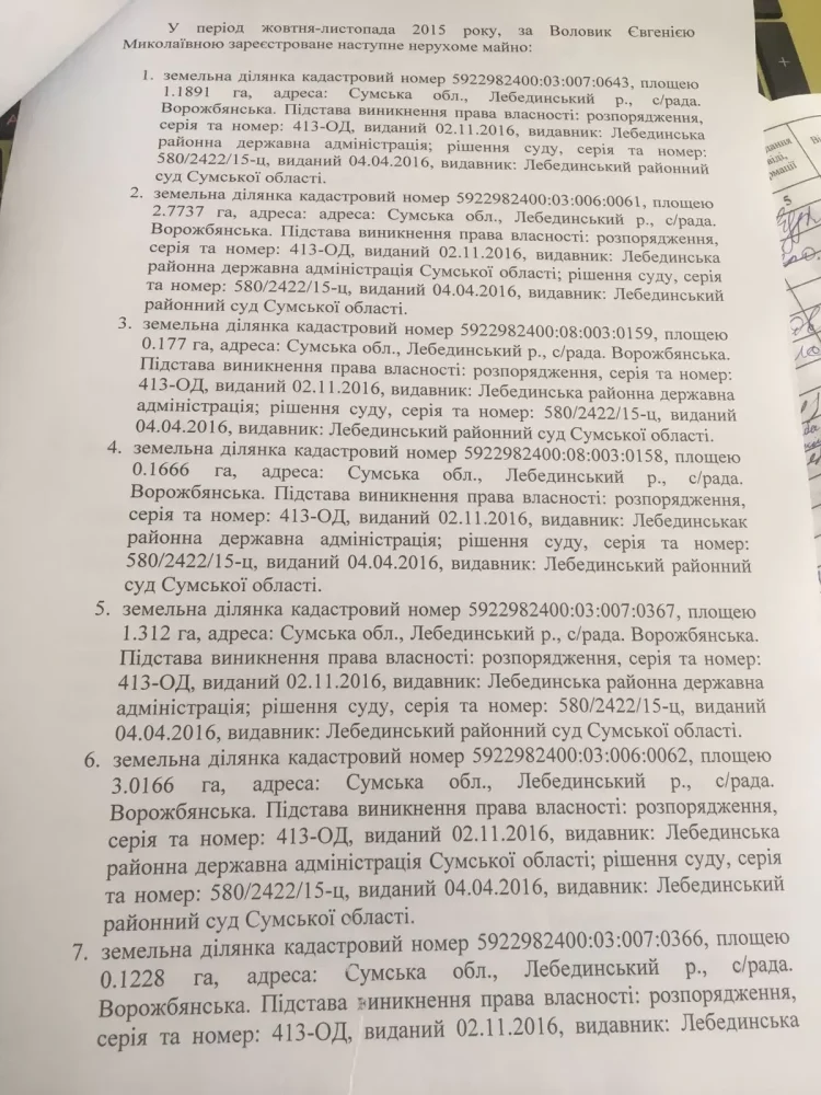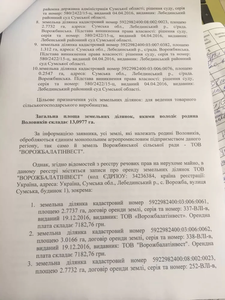Тісні стосунки судді та екс-нардепа, можливо, сталися на фермерській ниві. Справа в тому, що у 2018 році з Воловиком уже був скандал. Тоді організація «Стоп корупції» звернулася з НАЗК із запитом про перевірку голови адмінсуду через ймовірне приховування доходів від оренди землі. Громадські люди заявили, що дружина Євгена Воловик володіє 10 земельними ділянками, які здає в оренду – проте офіційно оренда зареєстрована лише на три ділянки. Термін оренди 3 земельних ділянок складає 10 років. Інші ж 7 земельних ділянок, хоч і обробляються ТОВ «Ворожбалатінвест», проте оренда не зареєстрована у реєстрі прав на нерухоме майно внаслідок домовленостей між сторонами. Таким чином, суддя нібито не декларує своїх додаткових доходів. Проте активісти результатів перевірки декларації не оприлюднили.